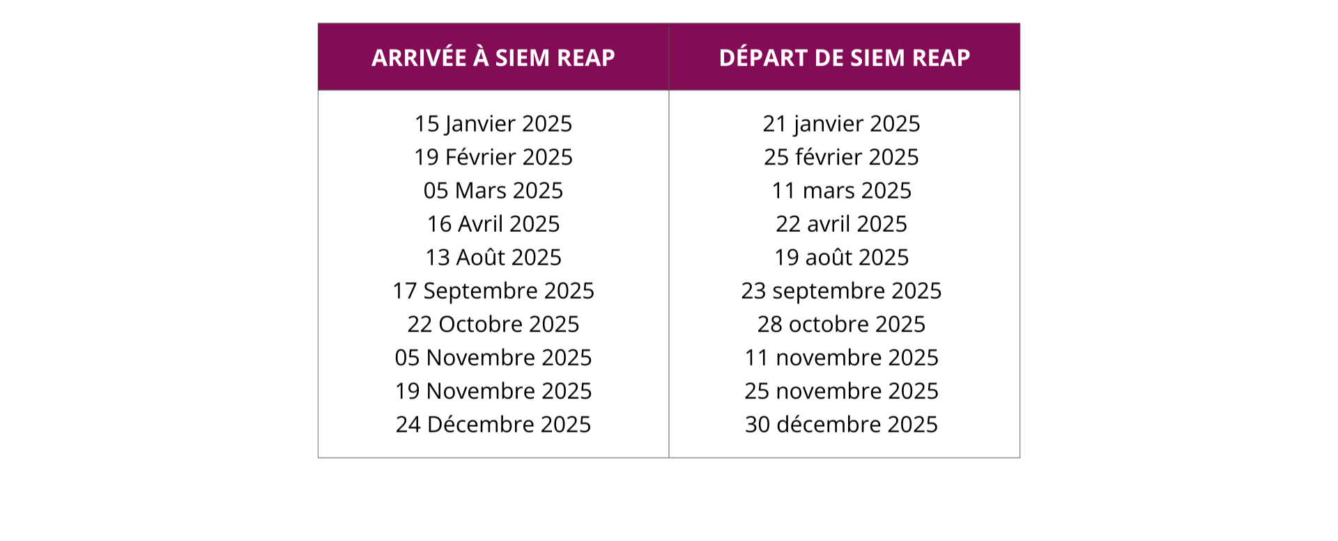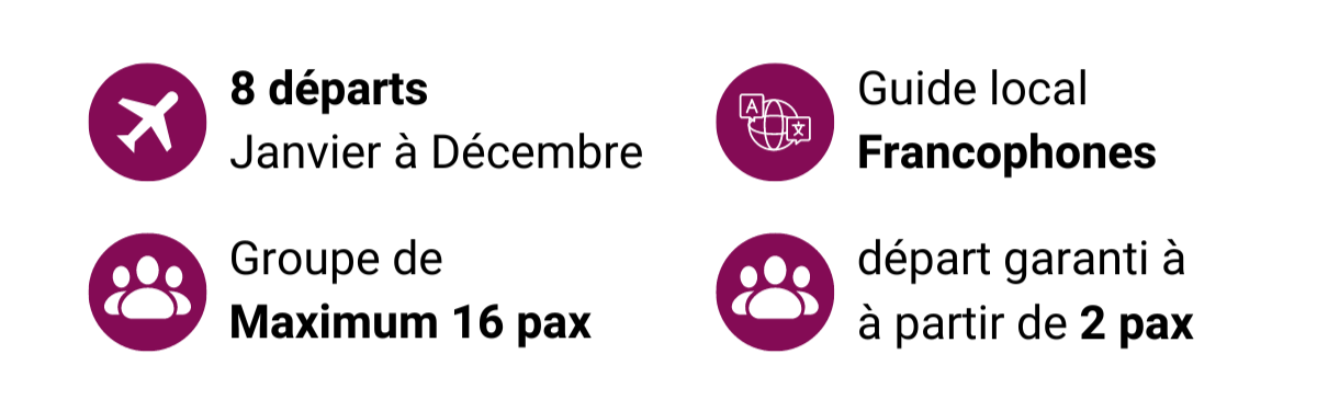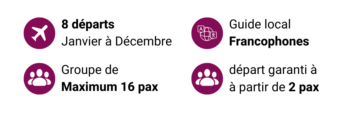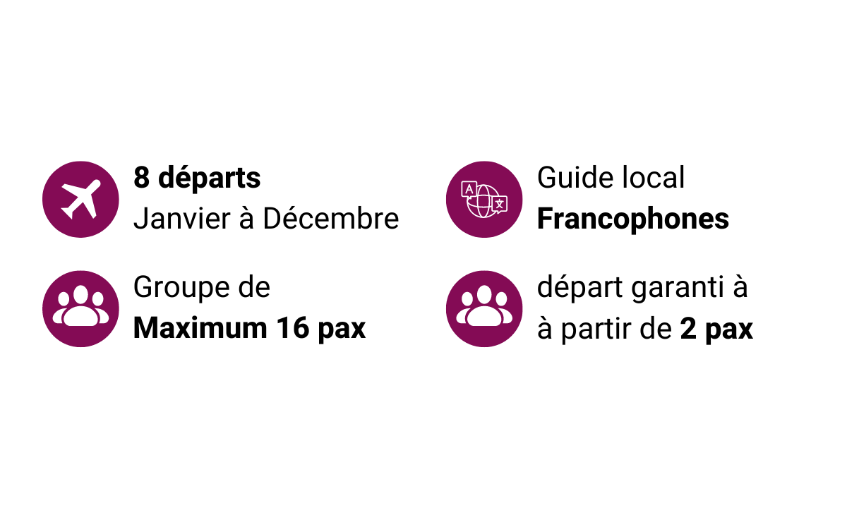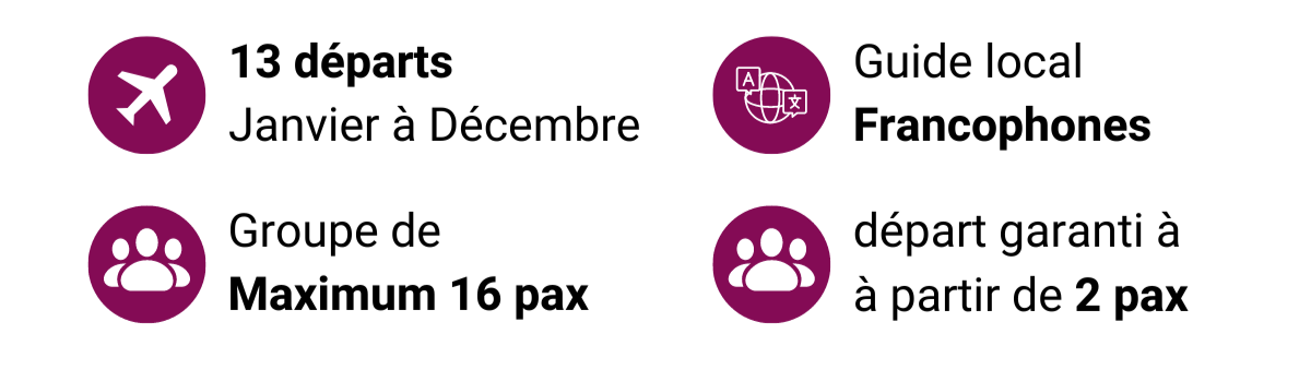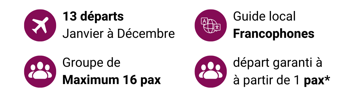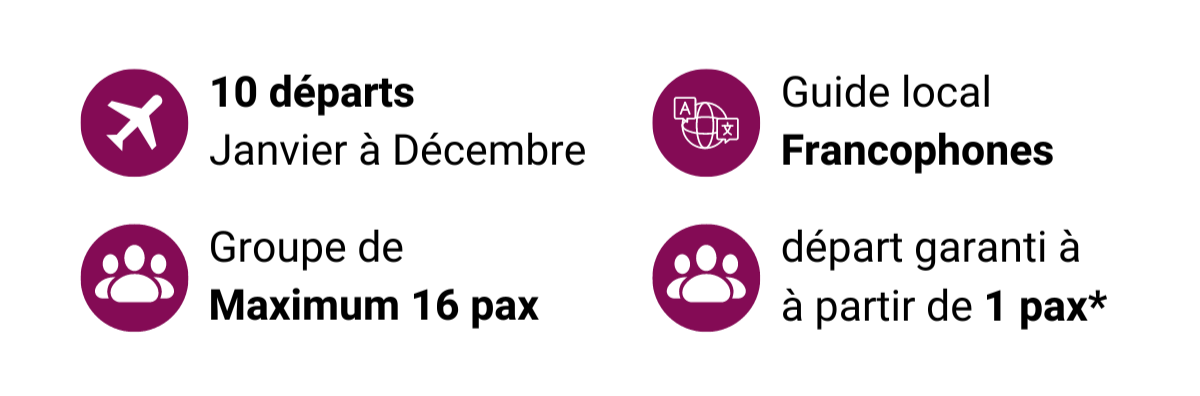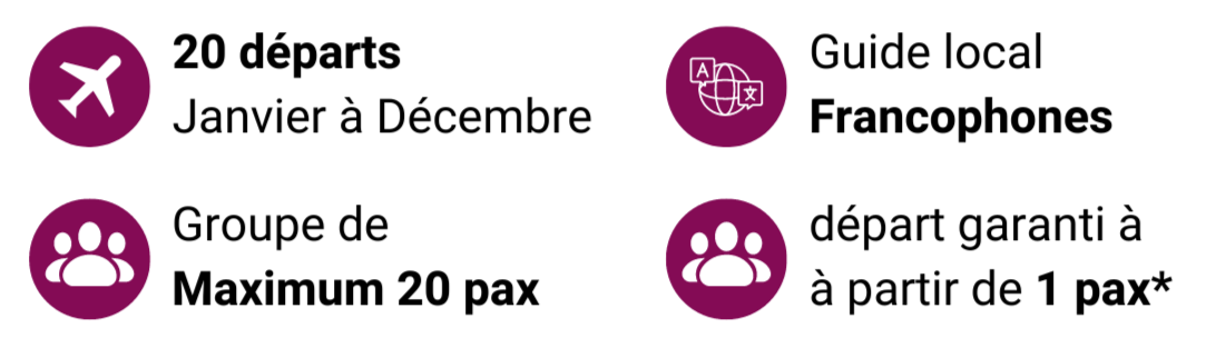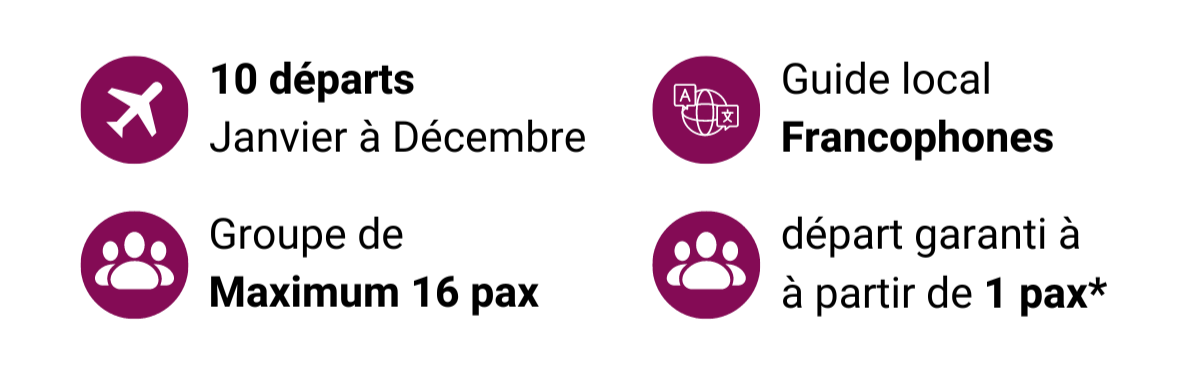 *Départ garanti à partir de 1 personne pendant la haute saison (du 05/1/2025 au 30/04/2025 & du 1/10/2025 au 20/12/2025)