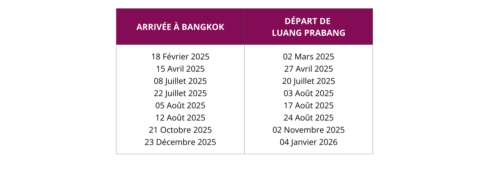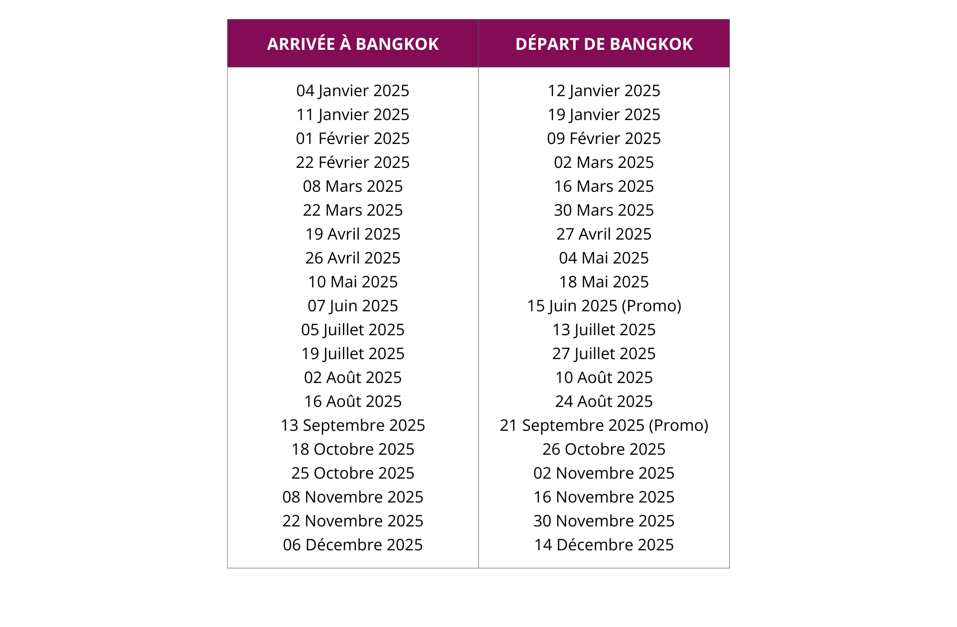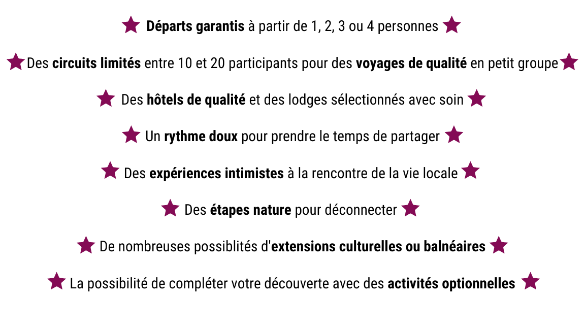 *Départs garantis à partir de 1 personne en haute saison (du 05/01/2025 au 30/04/2025 et du 01/10/2025 au 20/12/2025)
